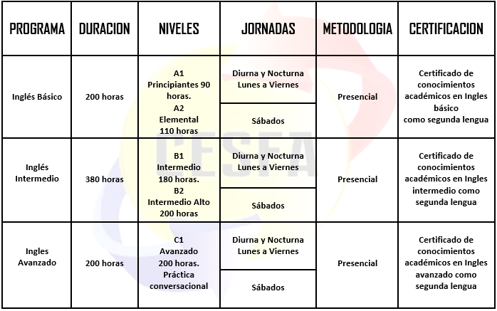 Con más de 30 años de experiencia, CESFA ofrece un método práctico y efectivo en grupos de máximo diez estudiantes haciendo énfasis en la conversación y basado en el Marco común Europeo de Referencia para las Lenguas “MCER”. En CESFA Usted puede prepararse para enfrentar los retos que le exigen un buen manejo del inglés a un bajo costo, comparado con otras instituciones a nivel nacional.